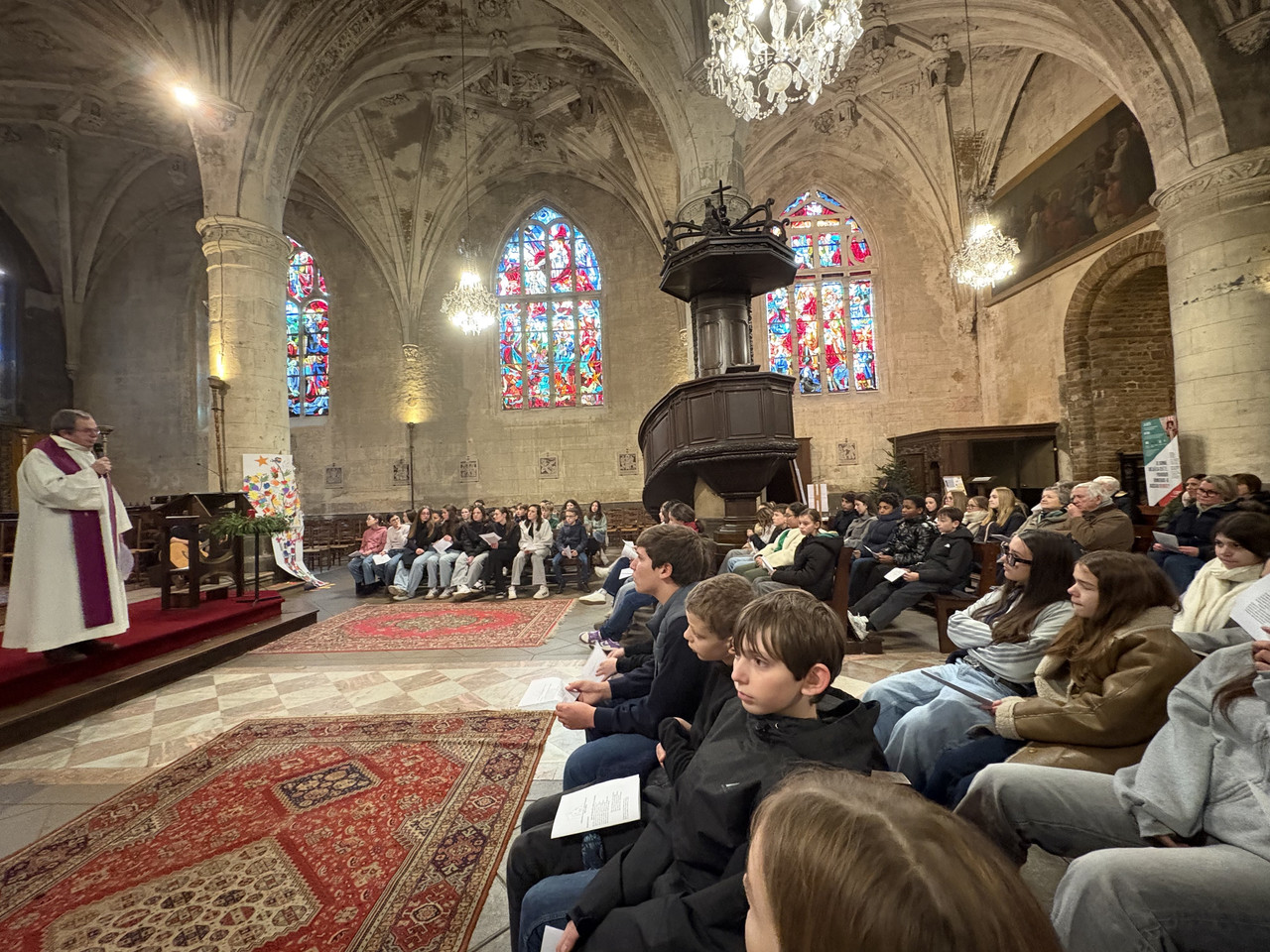 Parallèlement, 70 élèves ont participé à la célébration de l’Avent à St-Martin animée par la chorale du collège que dirige M. Poussin, le professeur d’éducation musicale. Ce groupe rassemblait des élèves croyants, non croyants ainsi que des élèves musulmans. Ce moment de partage, mené par le père Loïc, portait un message fort de solidarité, de fraternité, de vivre ensemble et de paix, thématiques